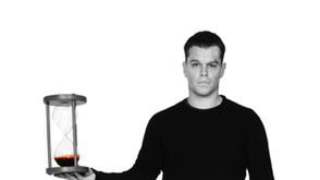 Aktor Matt Damon trzyma wypełnioną sztuczną krwią klepsydrę, którą za chwilę rozbije