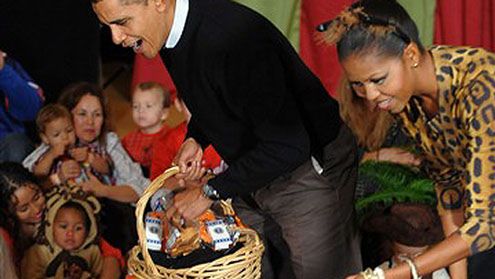 Z okazji Halloween Barack i Michelle Obama zaprosili dzieci, by wręczyć im ciastka i cukierki. Pierwsza Dama była przebrana za Kobietę-Kota, reszta gości miała równie efektowne przebrania. Dzieciom z rodzin wojskowych i pracujących dla Białego Domu - podświetlonego specjalnie na pomarańczowo - przygrywała orkiestra rodem... z kostnicy.