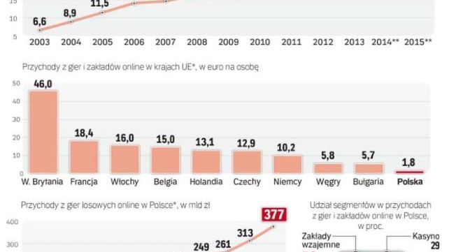 Stowarzyszenie Pracodawców i Pracowników Firm Bukmacherskich jako przykład podaje Danię czy Włochy, gdzie udział „białej strefy" rynku wynosi odpowiednio 77,2 proc. i 78,3 proc. We Włoszech jeszcze w 2006 r. cały rynek należał do nielegalnych operatorów i nie generował żadnych wpływów do państwowej kasy. Natomiast w 2011 r. podatki z tytułu gier losowych online sięgnęły już 200 mln euro.