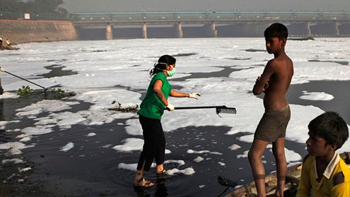 Ochotnicy oczyszczają brzeg rzeki Yamuna, w Nowym Dehli. 17 marca kilkaset osób zebrało się, by wyciągnąć z rzeki butelki, folię oraz inne śmieci. Zgodnie z danymi podanymi przez fundację Art of Living do rzeki Yamuna spuszczanych jest dziennie 3,6 miliarda ton wody zanieczyszczanej ściekami przemysłowymi. Rzeka zaopatruje 60 procent regionu Delhi.