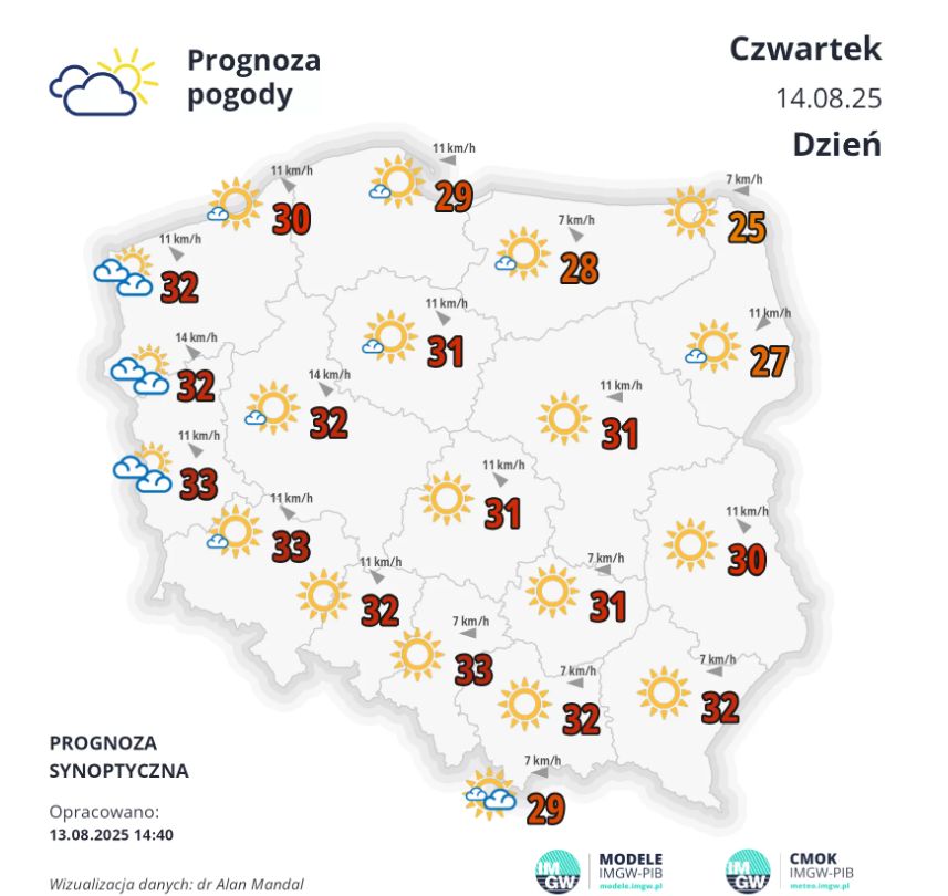 Czwartek przyniesie bardzo słoneczną pogodę z niewielkim miejscowym zachmurzeniem. Temperatura osiągnie 34 st. C na południu i zachodzie, 31 st. C w centrum i 25 st. C w Suwałkach. Wiatr będzie słaby.