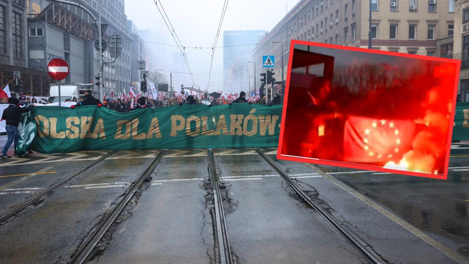 Młodzież Wszechpolska udostępniła w serwisie X wideo, na którym widać, jak grupa zamaskowanych osób podpala przy pomocy racy flagę Unii Europejskiej. Słychać skandowanie: "suwerenność nie na sprzedaż". Nagranie zniknęło już z sieci.