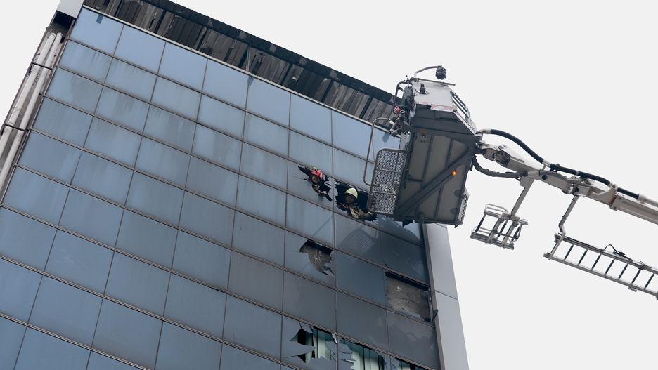 W materiale widać również pracowników, którzy uciekali z wyższych pięter budynku, korzystając z przenośnych drabin.