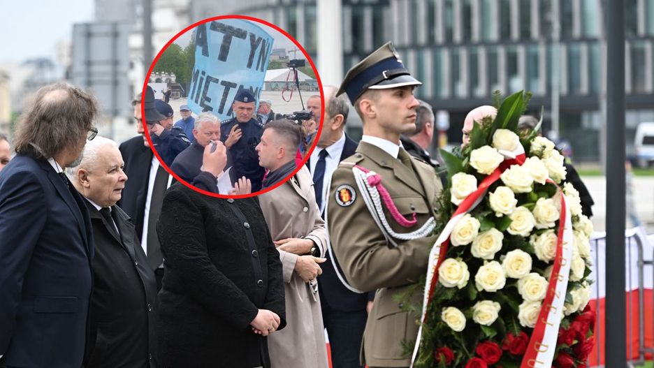 Wieniec, który co miesiąc składają przeciwnicy PiS, zawiera napis: "Pamięci 95 ofiar Lecha Kaczyńskiego, który ignorując wszelkie procedury, nakazał pilotom lądować w Smoleńsku w skrajnie trudnych warunkach. Spoczywajcie w pokoju. Naród Polski".