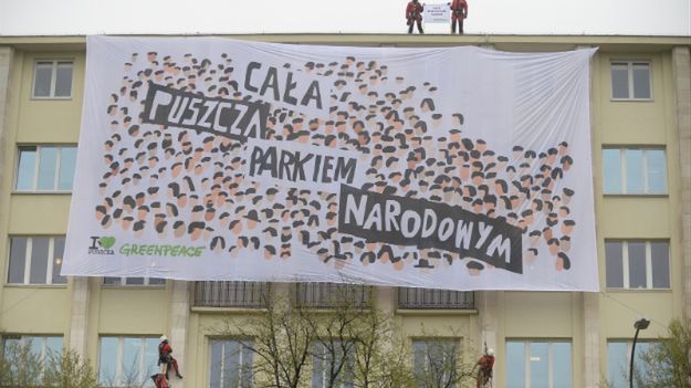 Działacze Greenpeace Polska weszli we wtorek rano na dach budynku Ministerstwa Środowiska i rozwiesili baner "Cała Puszcza Parkiem Narodowym", protestując przeciwko planowanej wycince drzew zaatakowanych przez kornika drukarza na terenie Puszczy Białowieskiej.