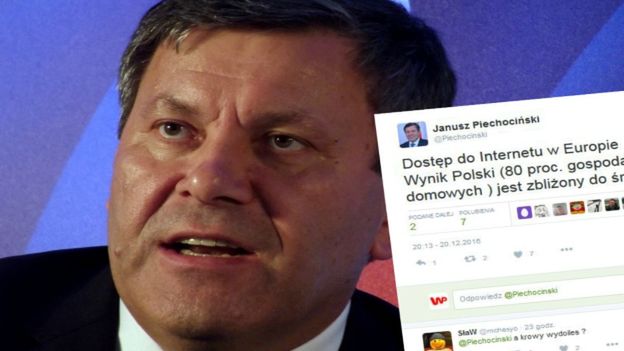 We wtorek Piechociński "ćwierkną" o tym, że "dostęp do Internetu w Europie Wynik Polski (80 proc. gospodarstw domowych ) jest zbliżony do średniej unijnej." Pod jego wpisem jeden z internautów zamieścił niezbyt elokwentny komentarz: "a krowy wydoiłeś?"
