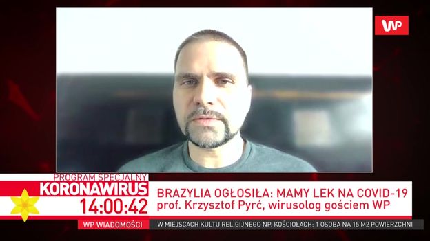 Wirusolog prof. Krzysztof Pyrć pracuje nad lekiem na koronawirusa. Pytany w programie specjalnym WP, kiedy rozpocznie się testowanie substancji na ludziach, odpowiedział: "do tego jeszcze daleka droga". Odniósł się też do doniesień z innych krajów, według których lek na koronawirusa już powstał. - Doradzałbym kolegom, by zachowali trochę skromności i umiaru w tym, co mówią. W tym momencie nikt nie ma leku. Nie ma żadnych dowodów na to, że którakolwiek z substancji będzie działała - podkreślił.