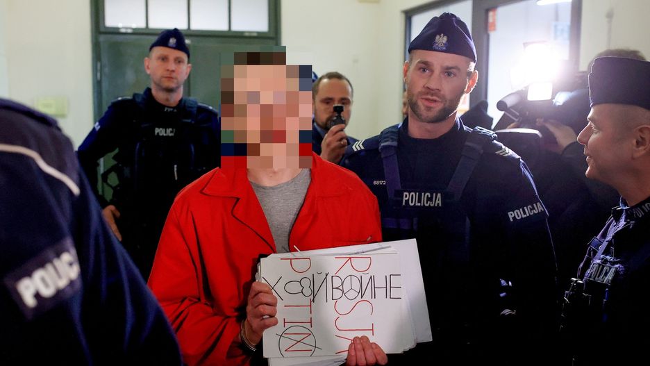 Na salę rozpraw został najpierw doprowadzony Igor R., ubrany w czerwony więzienny drelich. Trzymał w rękach kartkę z krzyżującymi się symbolami i napisami: "Rosja", "Putin" i "Ch… wojnie". Ten ostatni wyraz zapisał cyrylicą, w literę "o" wpisując symbol pacyfy. Chwilę później policjanci wprowadzili jego żonę.