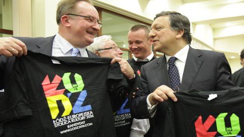 Na zdjęciu: Jose Manuel Barroso i eurodeputowany Jacek Saryusz-Wolski pozuja do zdjęcia trzymając koszulki Łodzi - kandydata do tytułu Europejskiej Stolicy Kultury.