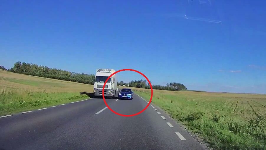 Autorem nagrania jest pan Piotr, który jechał z prędkością około 90 km/h niedaleko miejscowości Żalno. Gdy dojeżdżał do zakrętu, zauważył, że wprost na niego jedzie niebieskie bmw. Auto minęło ciężarówkę i popędziło dalej.