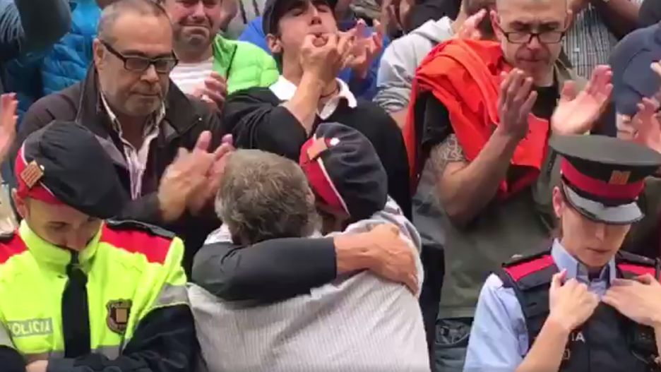 Katalońscy policjanci wysłani przez władze do zablokowania referendum stoją przed punktem wyborczym i płaczą. W tym czasie policjanci przysłani z innych części Hiszpanii pacyfikują cywilów. Są setki rannych.