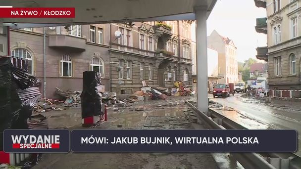 Reporter Wirtualnej Polski Jakub Bujnik z Kłodzka pokazał, jak wygląda sytuacja po ustąpieniu wody w mieście. - Dopiero rozpoczyna się wielkie sprzątanie. Władze miasta przekazały, żeby meble wyrzucać na ulicę - relacjonuje w wydaniu specjalnym Poranka Wirtualnej Polski. Bujnik wskazuje przy tym, że to nie śmieci są teraz największym problemem, a brak dostępu do bieżącej wody. - Z 21 ujęć wody, czynne są tylko dwa. Taka sytuacja może potrwać do końca tygodnia - przekazał. - Ta woda w kranie nie nadaje się do niczego. Nie można z niej korzystać - podkreślił. Sytuacja jest jednak zła w całym powiecie - Wiele widziałem, ale sytuacja w Lądku-Zdrój jest naprawdę katastroficzna - powiedział. - Tutaj będzie potrzeba długich miesięcy, żeby doprowadzić te miasta do stanu sprzed ostatnich wydarzeń - wskazał.