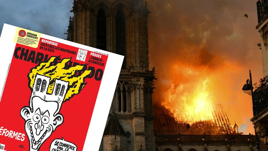 Tygodnik "Charlie Hebdo" opublikował okładkę najnowszego numeru. Widać na nim płonącą katedrę Notre Dame ustawioną na głowie pewnej postaci. "Zaczynam od szkieletu" - można przeczytać w komiksowym dymku obok napisu "reformy".