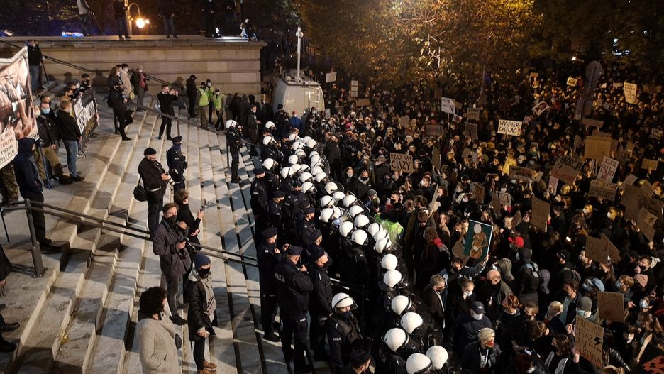Kolejny dzień protestów na ulicach miast po decyzji Trybunału Konstytucyjnego ws. aborcji. Emocje sięgają zenitu przed katedrą w Katowicach. Policja wyciąga z tłumu pojedyncze osoby.