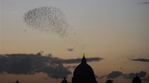 Stado kawek przelatuje nad kopułą Bazyliki św. Piotra w Rzymie.