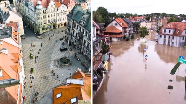 Trudna sytuacja powodziowa w Kłodzku i Lądku-Zdroju. Udostępniamy nagrania sprzed i po powodzi, która przeszła przez te miejscowości. Ujęcia z perspektywy drona ukazują, z jak potężnym żywiołem zmagają się tam mieszkańcy. Jeszcze niedawno, oba regiony były w wakacje odwiedzane przez tysiące turystów, przyciągały widokami, historią i architekturą. Dziś Kłodzko i Lądek-Zdrój są nie do poznania. W wielu rejonach nadal występują problemy z dostawą wody i prądu, a niektóre miejscowości wciąż są odcięte od świata. W Lądku-Zdroju część zabudowy jest całkowicie zniszczona. Dolna część miasta jest zasypana błotem i gruzem, a do niektórych miejsc można dotrzeć jedynie od strony Czech. Choć górna, uzdrowiskowa część miasta jest w lepszym stanie, odbudowa infrastruktury po powodzi może potrwać lata. Prognozy pogody wskazują na poprawę, ale lokalne władze ostrzegają, że sytuacja nadal może się zmieniać. Warto zachować ostrożność w nadchodzących dniach.