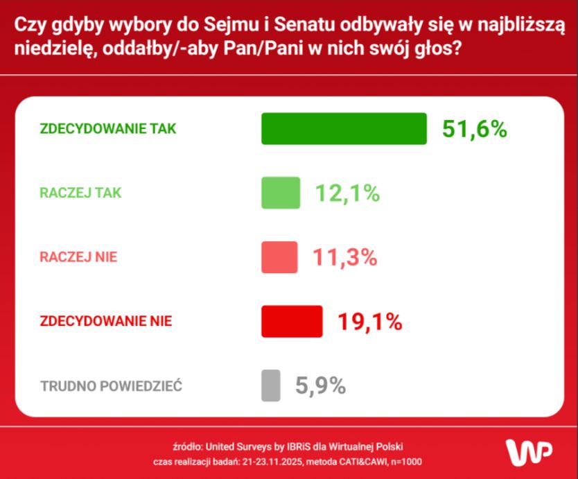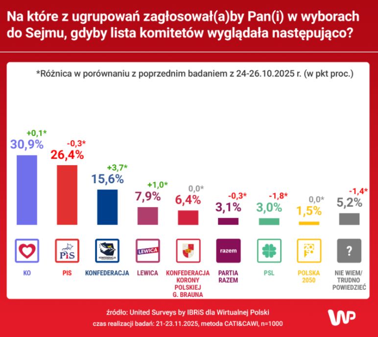Sondaż partyjny został przeprowadzony przed United Surveys by IBRiS dla Wirtualnej Polski metodą CATI/CAWI, w dniach 21-23 listopada 2025 roku, na próbie N=1000.
