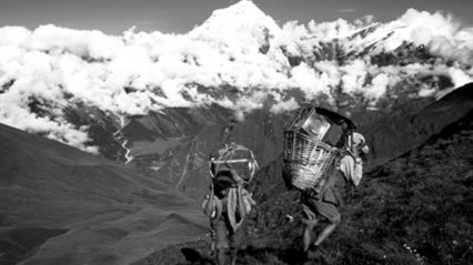 Na zdjęciu: tragarze wchodzą na wzgórze niedaleko Francuskiej Przełęczy; w tle Dhaulagiri.