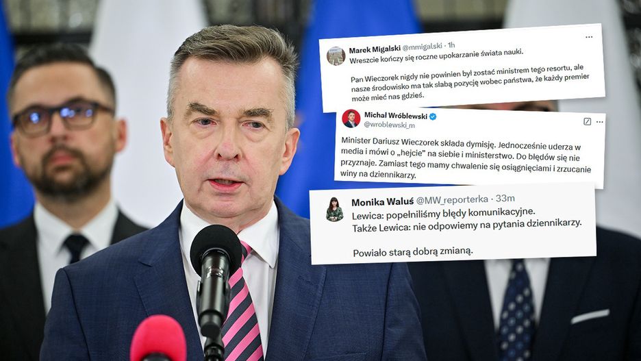 "Minister Dariusz Wieczorek składa dymisję. Jednocześnie uderza w media i mówi o 'hejcie' na siebie i ministerstwo. Do błędów się nie przyznaje. Zamiast tego mamy chwalenie się osiągnięciami i zrzucanie winy na dziennikarzy" - napisał dziennikarz WP Michał Wróblewski.