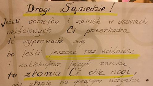 Napięta sytuacja w budynku Internauty Alzira znalazła odzwierciedlenie w jednym z ogłoszeń, wywieszonych na klatce schodowej. Jak widać, w sąsiedzkich kłótniach wykorzystuje się niekiedy radykalne metody.