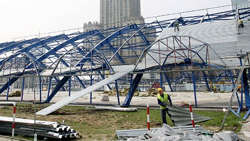 Trwa usuwanie pokrycia dachowego i ścian zewnętrznych hali Kupieckich Domów Towarowych w Warszawie. Firma wyburzająca chce zdemontować halę do końca maja.