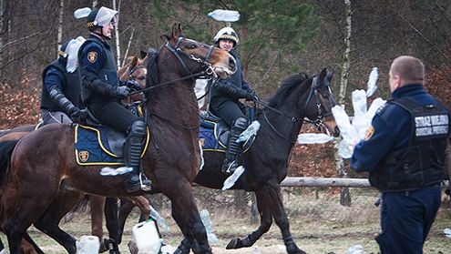 Patrole konne ćwiczyły także sytuacje, podczas których konie musiały wziąć udział w interwencji wobec agresywnych grup osób. W tym przypadku pozorowano rzucanie w konie pustymi, plastikowymi butelkami.