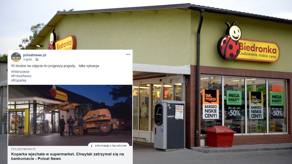 O niecodziennej sytuacji jako pierwsi poinformowali dziennikarze Polsat News. W drodze na zdjęcia dostrzegli koparkę wbitą w ścianę supermarketu. Na nagraniu widać, że łyżka przebiła szybę, wbiła się do środka i zatrzymała tuż obok bankomatu.