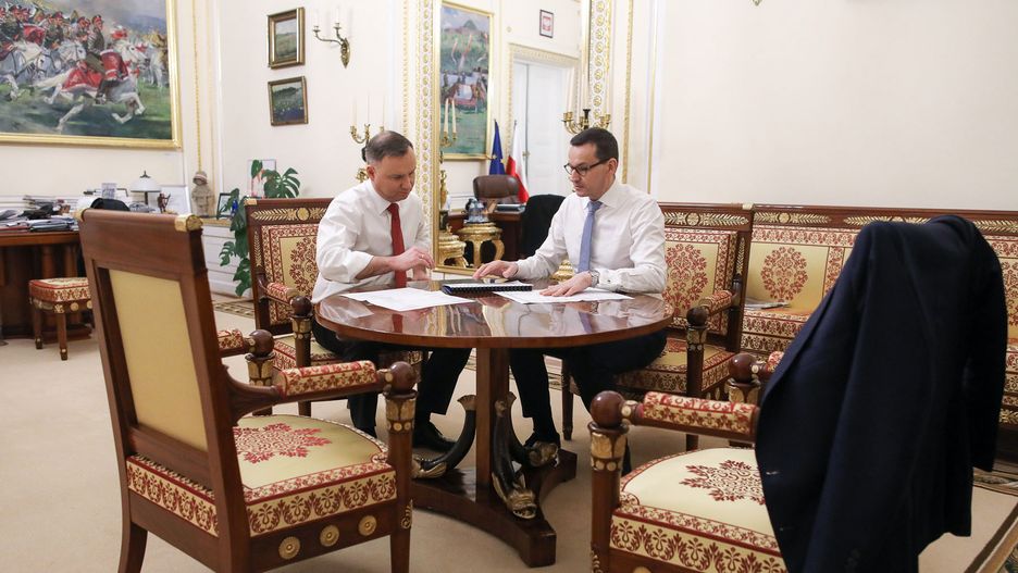 "Praca w czasach koronawirusa trwa do późnych godzin nocnych. Zarówno dla mnie, jak i dla prezydenta Andrzeja Dudy. Mamy do podjęcia wiele trudnych decyzji w związku z epidemią"- napisał w mediach społecznościowych szef rządu PiS po spotkaniu z prezydentem.