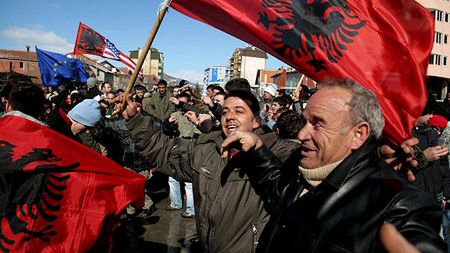 Albańczycy z Kosowa trzymają odwróconą do góry nogami flagę Stanów Zjednoczonych. W tle ogromna flaga Albanii namalowana na ścianie budynku w Prisztinie. Kosowo nie ma jeszcze swojej flagi. Albańczycy, stanowią 90% ludności Kosowa. W niedzielę spodziewane jest ogłoszenie niepodległości Kosowa, będącego formalnie prowincją Serbii. Wielomiesięczne negocjacje na temat jego przyszłego statusu nie przyniosły rezultatów. Serbia zgadza się jedynie na szeroką autonomię prowincji, podczas gdy kosowscy Albańczycy domagają się niepodległości.