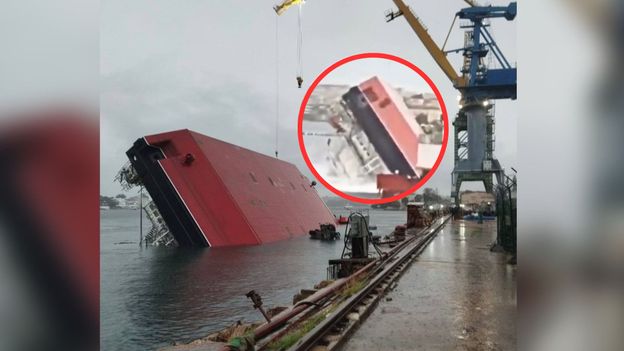Wszystko działo się w poniedziałek 27 października. Budowany od 2017 roku potężny, pływający dźwig PK-700 "Grigorij Prosiankin" przewrócił się na bok. Na nagraniu z portu na Krymie widać ten moment, a w pewnym momencie można również dostrzec dwóch ludzi, którzy wpadli do wody w wyniku gwałtownego przechylenia się jednostki.
