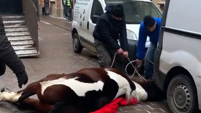 - Koń leżał na ziemi, co jakiś czas wstawał i upadał po kilku krokach, chociaż ciężko to tak nazwać, bo nie mógł ustać. Nie było weterynarza. Właściciele zorganizowali własny transport - dodaje pan Łukasz. Sposób pomocy określił jako koszmarny. Zwierzę było siłą ciągnięte pasami przez kilku mężczyzn tak, aby za wszelką cenę załadować je na przyczepę. Stojąca obok policja nie reagowała.