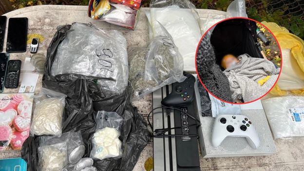 Niemowlę zostało przewiezione karetką do szpitala w celu sprawdzenia jego stanu zdrowia. Podczas badań wykryto u niego w organizmie kokainę. Jego rodzice zostali zatrzymani. Podczas przeszukiwań trafiono na skrytki, w których znaleziono 2 kilogramy marihuany, kokainy i mefedronu oraz wagi elektroniczne, telefony komórkowe i gotówkę.