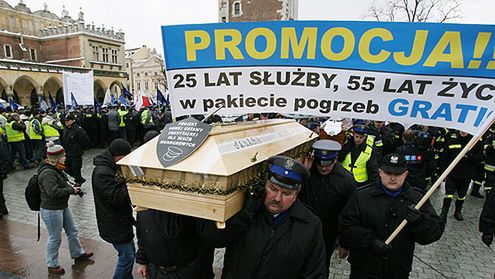 Kraków, 19.02.2009r. Manifestanci nieśli ze sobą trumny i transparenty m.in. z napisem "W 2009 umrze policja" i "Przy Schetynie glina zginie".