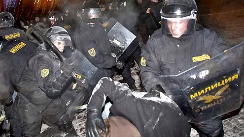 Starcie uczestników powyborczej manifestacji na Placu Niepodległości z milicją w Mińsku. Protestujący zebrali się wcześniej na Placu Październikowym, by zaprotestować przeciwko przebiegowi wyborów prezydenckich.
