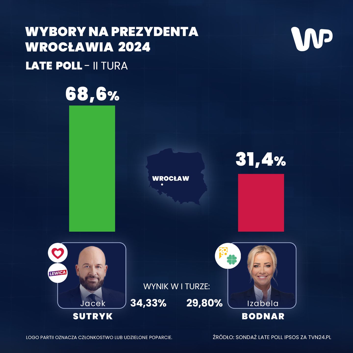Z sondażu late poll Ipsos (dla tvn24.pl) wynika, że w drugiej turze wyborów na prezydenta Wrocławia zwyciężył Jacek Sutryk, który otrzymał 68,6 proc. głosów. Izabela Bodnar, kandydatka Trzeciej Drogi, dostała 31,4 proc. głosów.