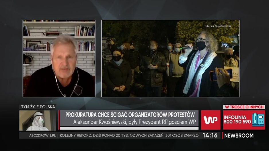 Były prezydent Aleksander Kwaśniewski był gościem programu "Newsroom". Polityk pytany był m.in. o to czy sposób, w jaki rząd zamierza zakończyć protesty, jest słuszny. Przypomnijmy, że Prokurator Krajowy napisał do podległych sobie prokuratorów, aby "bezzwłocznie wydawali decyzje procesowe" wobec organizatorów protestów. Kwaśniewski ocenił takie kroki jednoznacznie źle. - Skazywanie ludzi w pokazowych procesach sprawi, że będzie ich wychodzić na ulice jeszcze więcej. To może stworzyć pozorny spokój, który nie będzie miał nic wspólnego z prawdziwymi nastrojami - mówił. Były prezydent dodał, że jest zwolennikiem tzw. "kompromisu aborcyjnego" a poruszanie teraz tego tematu uznał za cyniczne. - Pamiętam, jak Jarosław Kaczyński z mównicy sejmowej uspokajał swoich radykałów, mówiąc, że ten radykalizm może uruchomić drugi, który będzie silniejszy. Ta polityka może kosztować życie ludzi, na ulicach mogą dziać się rzeczy straszne - zakończył swoją wypowiedź prezydent.