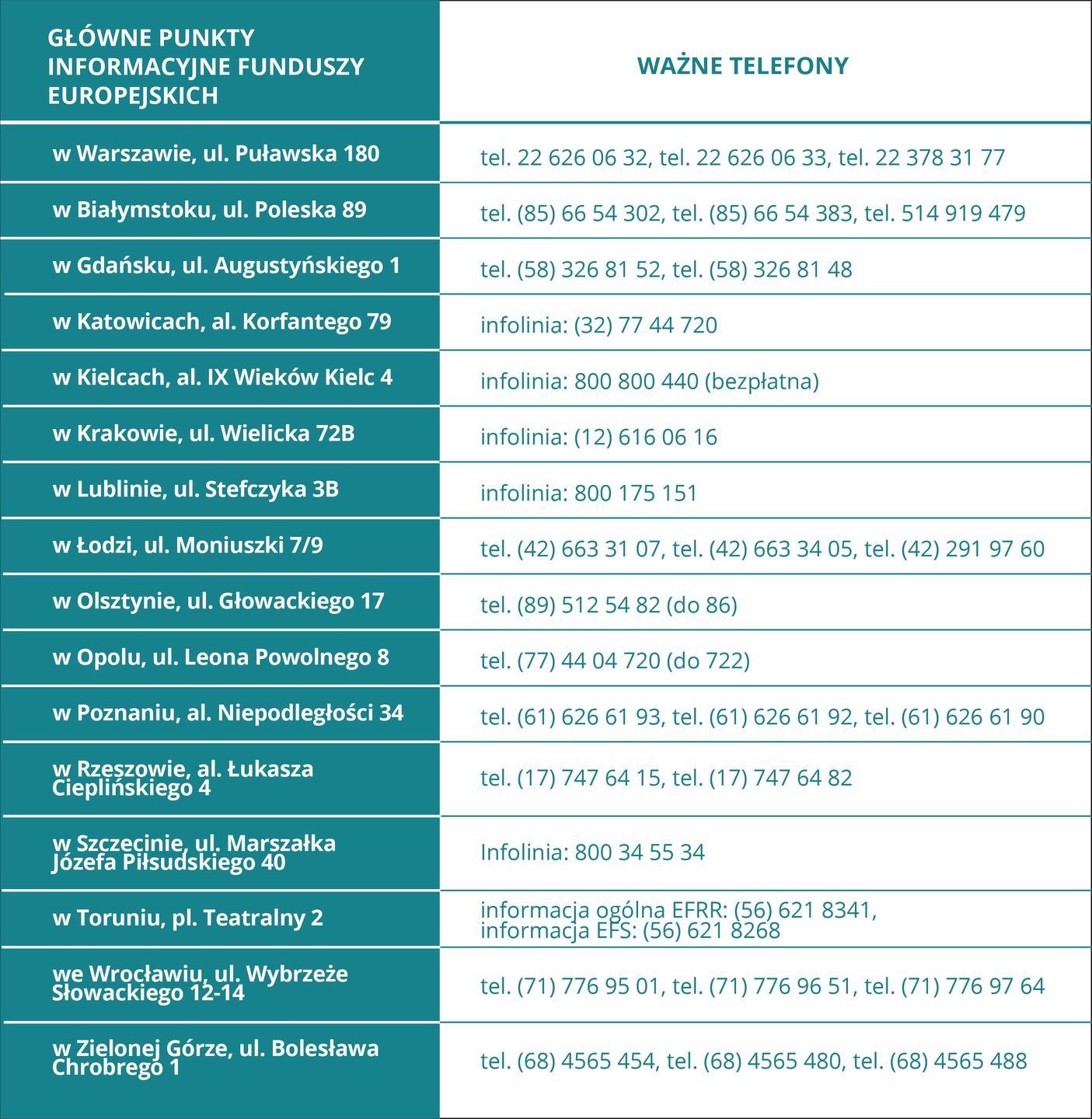 W celu ułatwienia przedsiębiorcom dostępu do informacji oraz wsparcia, poniżej znajduje się tabela z danymi kontaktowymi, takimi jak numer telefonu infolinii i adresy Głównych Punktów Informacyjnych Funduszy Europejskich. Dzięki temu przedsiębiorcy będą mieli szybki dostęp do niezbędnych informacji oraz będą mogli skorzystać z profesjonalnego wsparcia w trakcie aplikacji o dotacje na innowacje. Więcej danych kontaktowych można znaleźć na stronie www.funduszeeuropejskie.gov.pl/punkty