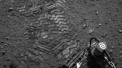 Opublikowane przez NASA zdjęcie pokazuje ślady kół, jakie na powierzchni Marsa zostawił łazik. Widać także powierzchnię planety.