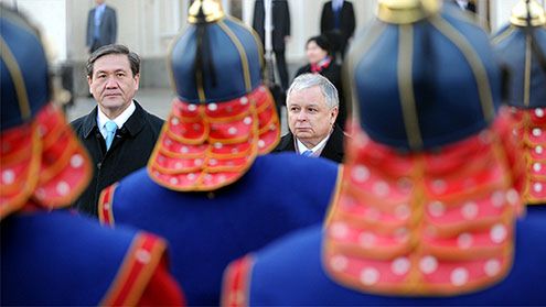 Prezydent Mongolii Nambaryn Enkhbayar i prezydent Lech Kaczyński podczas oficjalnego powitania.