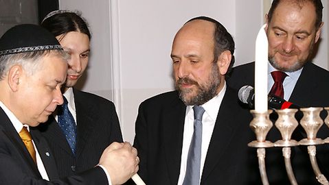 Michael Schudrich, naczelny rabin Polski, wprowadza prezydenta Lecha Kaczyńskiego z małżonką.