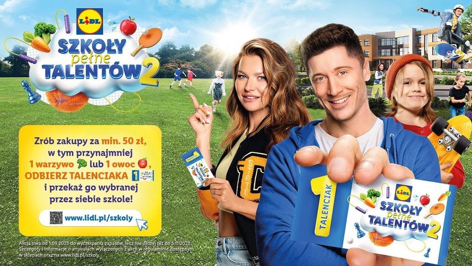Lidl Polska ponownie zamierza obudzić młode talenty wśród uczniów, dlatego wraz z rozpoczęciem roku szkolnego startuje z drugą edycją akcji "Szkoły Pełne Talentów". W ramach programu sieć przekaże szkołom w całym kraju wysokiej jakości sprzęt i wyposażenie. Wydarzenie ponownie wspierają Anna i Robert Lewandowscy. Akcja potrwa aż do 5 listopada br.