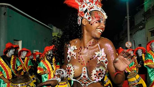 Piękne tancerki i bębniarze tańczą podczas pierwszego dnia parady "Llamadas", odbywającej się w stolicy Urugwaju - Montevideo. Podczas parady drużyny, nazywane "comparsas", złożone z bębniarzy i tancerek rywalizują o tytuł najlepszej w tradycyjnym tańcu i muzyce "candombe".