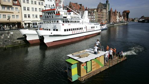 Tratwa Greenpeace dopływa do gdańskiej starówki. Pięć tygodni temu w Krakowie, Greenpeace rozpoczął kampanię "Rzeka nie jest ściekiem", której celem jest oczyszczenie polskich rzek. Aktywiści Greenpeace podczas 5-cio tygodniowego rejsu tratwą z Krakowa do Gdańska informowali o problemie ekologicznej dewastacji Wisły, prezentowali wystawę fotografii oraz zbierali podpisy pod petycją do polskiego rządu w celu podjęcia działań na rzecz oczyszczenia polskich rzek.