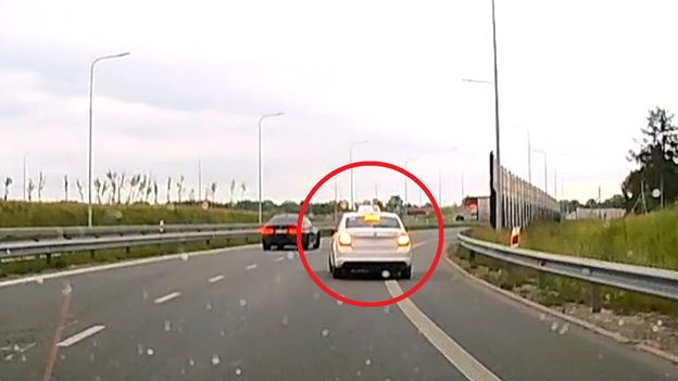 Kuriozalne zachowanie kierowcy taksówki. Na zjeździe z drogi ekspresowej S2 w kierunku Lublina doszło do groźnego zdarzenia. Nagle z niewiadomych przyczyn w tym miejscu zaczęła cofać taksówka, podczas gdy inne pojazdy były rozpędzone. Czytelnik Wirtualnej Polski, Hubert Szewczak podesłał nagranie z kamerki samochodowej z tego zdarzenia. W pewnym momencie na nagraniu widać, że gdyby nie czarne BMW, które gwałtownie zaczęło hamować i zmieniać pas, mężczyzna spóźniłby się z reakcją i niewiele zabrakło, by uderzył w cofającą taksówkę. - Zjechałem z S2 w S17, by dojechać z Warszawy do Lublina. Nagle auto obok mnie zaczęło hamować, to i ja zacząłem hamować. Kilka chwil później zza zakrętu wyłoniła się biała taksówka, która cofała w moją stronę. Niewiele brakowało i mogło dojść do tragedii. Sprawę zgłosiłem na policję - poinformował Szewczak w rozmowie z WP. Do podobnych zdarzeń na drogach szybkiego ruchu dochodzi coraz częściej. Kierowcy chcąc czasem naprawić swój błąd przy oszczędzeniu czasu, mogą nieumyślnie doprowadzić do poważnej tragedii, dlatego publikujemy to nagranie ku przestrodze. Według przepisów, za taki manewr grozi mandat w wysokości do 2 tys. złotych i 6 punktów karnych.