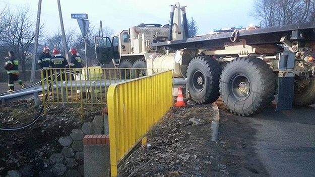 Kierowca wojskowego samochodu, próbując skręcić w lewo, zahaczył o barierkę na mostku. Wskutek uderzenia uszkodzony został bak samochodu, w którym znajdowało się kilkaset litrów paliwa.