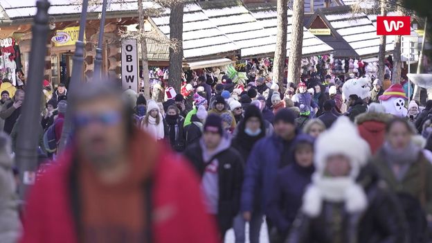 Do Zakopanego zjechały tłumy turystów. To efekt rozpoczynających się ferii i trwającego na Podhalu konkursu Pucharu Świata w skokach narciarskich. Z całej Polski przyjechali tu kibice oraz ci, którzy chcą wypocząć. - Naprawdę jest dużo ludzi - mówi mężczyzna, z którym reporter WP porozmawiał na Krupówkach. Na najsłynniejszym polskim deptaku momentami trudno przejść. Sporo osób spędza czas w restauracjach i sklepach. - Nie zakładam maseczki nigdzie - przyznaje jeden z odwiedzających Zakopane. Takie podejście tu nie należy do rzadkości. Więcej w materiale wideo.
