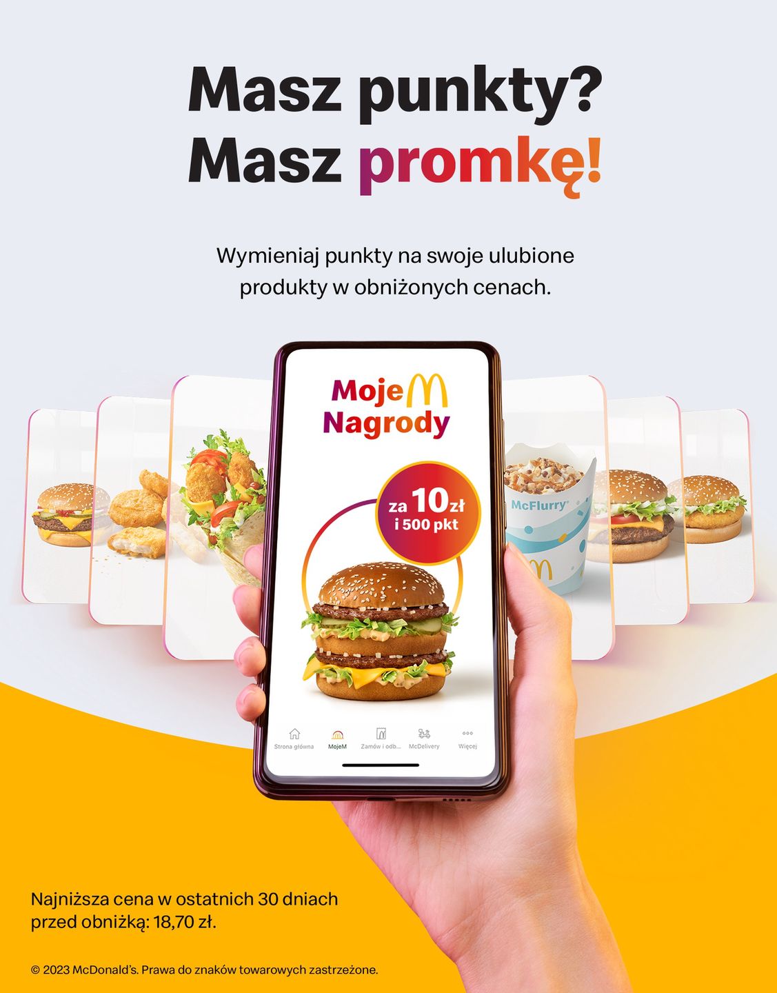 Mamy dobrą wiadomość dla łowców okazji. W aplikacji McDonald’s pojawiła się nowa promocja "Masz punkty? Masz promkę?", która dostępna jest w ramach programu lojalnościowego MojeM Nagrody. Od teraz zdobyte punkty możesz wykorzystać do zakupu swoich ulubionych produktów w specjalnych, obniżonych cenach. Nowa oferta daje więc możliwość wyboru: możesz jak dotąd zebrać więcej punktów i odebrać nagrodę albo już teraz posiadaną, mniejszą liczbę punktów wykorzystać w nowej promocji. Decyzja należy do Ciebie!
