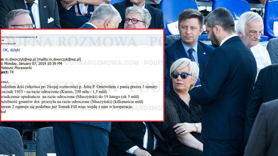 "Pani Julia" to, jak łatwo się domyślić, prezes Trybunału Konstytucyjnego Julia Przyłębska. Minister Dworczyk omawiał z nią nadchodzące decyzje, jakie miał podjąć Trybunał. W mailu pojawiły się konkretnie daty rozpraw, a także nazwiska i kwoty (w nawiasach), które wiązałyby się z kosztami dla budżetu państwa. Chodzi o dziesiątki i setki miliardów złotych.