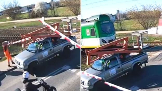 Brak wyobraźni może prowadzić do poważnych konsekwencji. Na własnej skórze przekonał się o tym kierowca pojazdu, który w Płochocinie pod Warszawą został nagrany na przejeździe kolejowym. Na początku kwietnia doszło tam do niebezpiecznego zdarzenia. Kamera monitoringu wszystko nagrała i teraz PKP udostępniły materiał ku przestrodze. Widać na nim, jak mężczyzna zlekceważył czerwone światło na sygnalizatorze, wjechał na przejazd, a po chwili opadająca rogatka oparła się na masce jego auta. Okazało się, że po tym jak przejechał pierwszy pociąg, zaraz tamtędy miał jechać drugi. Rogatki otworzyły się na chwilę, ale dalej paliło się czerwone światło. Dzięki temu, że auto uderzyło w rogatkę, służby techniczne otrzymały sygnał o tej sytuacji i szybko zareagowały. Maszynista otrzymał polecenie jazdy z prędkością 20 km/h oraz nadania sygnału "baczność". W ten sposób pociąg minął samochód o centymetry. Nikomu nic się nie stało.