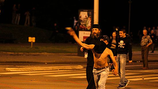 Mimo to w centrum serbskiej stolicy doszło do brutalnych starć policji z uczestnikami pochodu, którzy rzucali w funkcjonariuszy kamieniami i butelkami. Kontynuowali pochód przez miasto, niszcząc przy tym śmietniki i sygnalizację świetlną oraz odpalając petardy. W parku naprzeciw parlamentu doszło do regularnej bijatyki, która rozprzestrzeniła się na przyległe ulice - pisze dpa.